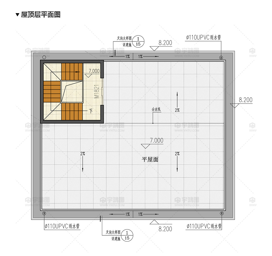 給排水圖: 樓層給排水平面圖:一層給排水平面圖,二層給排水平面圖; 屋頂給排水平面圖; 衛生間排水系統圖