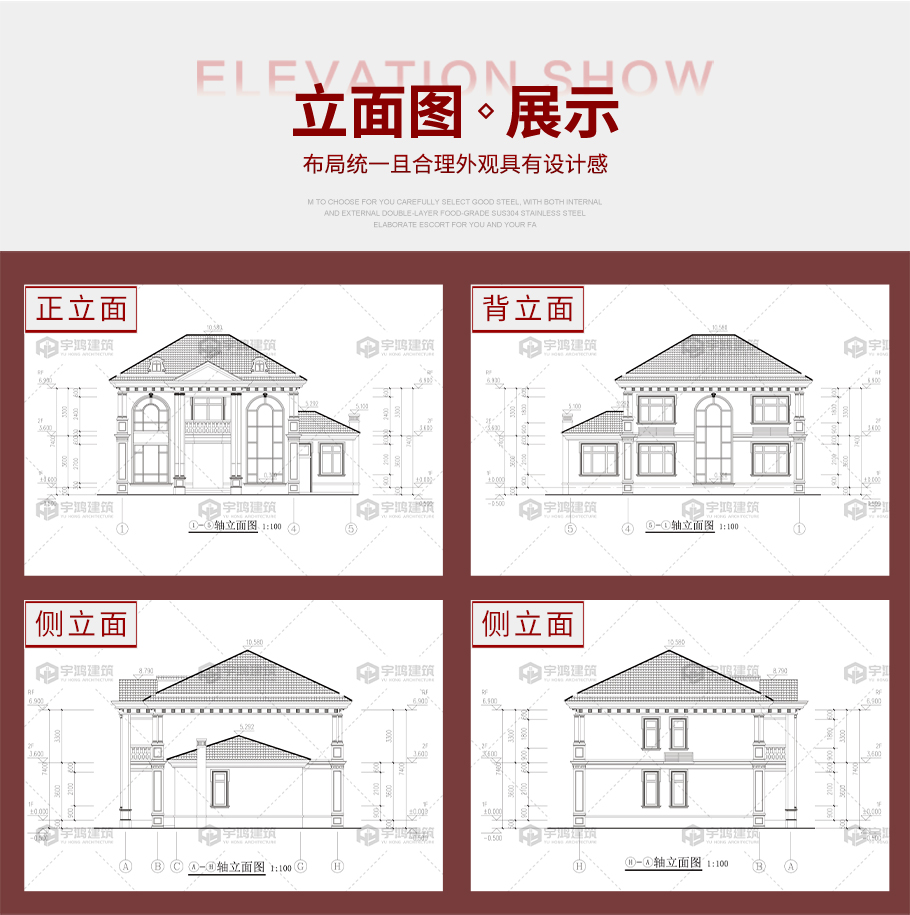 建筑圖: | 建筑平面圖:一層平面圖,二層平面圖; 建筑立面圖:東立面圖,西立面圖,南立面圖,北立面圖,剖面圖; 大樣圖:樓梯詳圖,細部大樣,門窗大樣 |